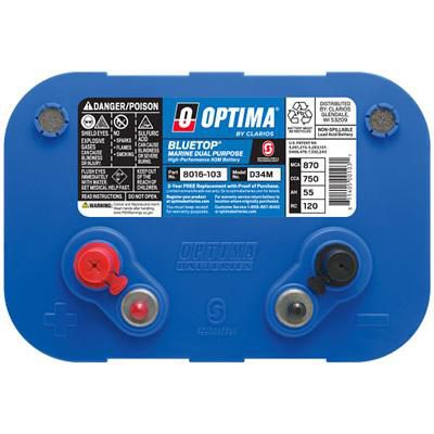Get powerful dual-purpose performance with the Optima Blue Top 34M AGM battery—designed for deep cycling and engine starting in marine and RV applications.
